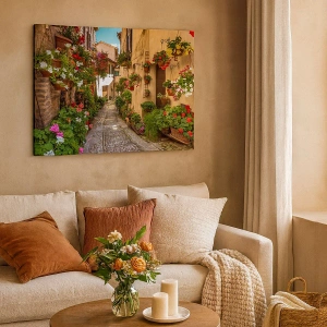 Trykket "Charmerende gade fuld af blomster og potter" er en unik dekoration, der introducerer atmosfæren af romantiske gåture gennem maleriske gyder. Det forestiller en smal, brostensbelagt gade omgivet af lejlighedshuse, dekoreret med et væld af farverige blomster i potter og kasser. Planternes intense farver kombineret med væggenes varme toner skaber en harmonisk komposition, der udstråler fred og naturens charme.