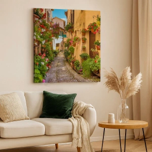 - Dette lærredstryk på 70x50 cm forestiller en malerisk gade fyldt med farverige blomster og potter. En perfekt dekoration for naturelskere og romantikelskere.