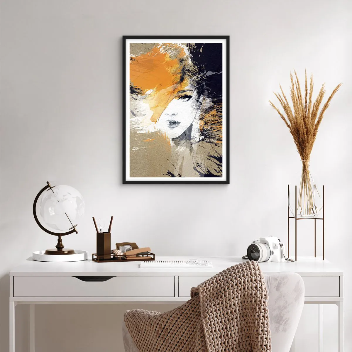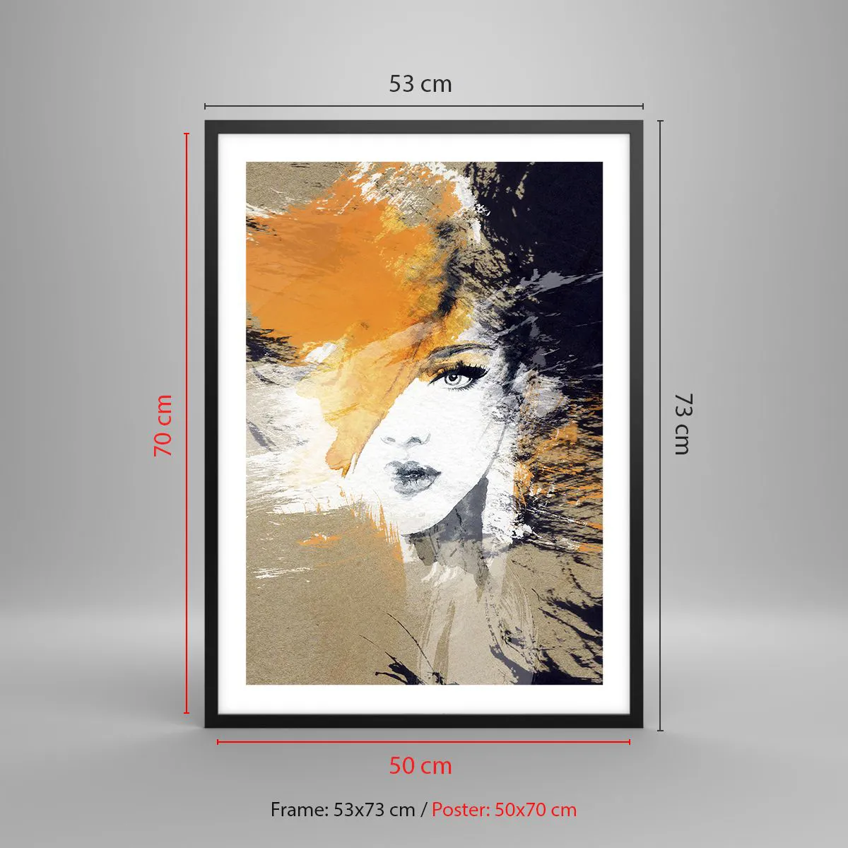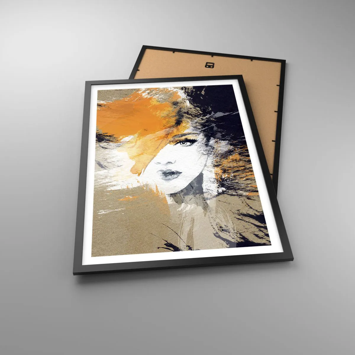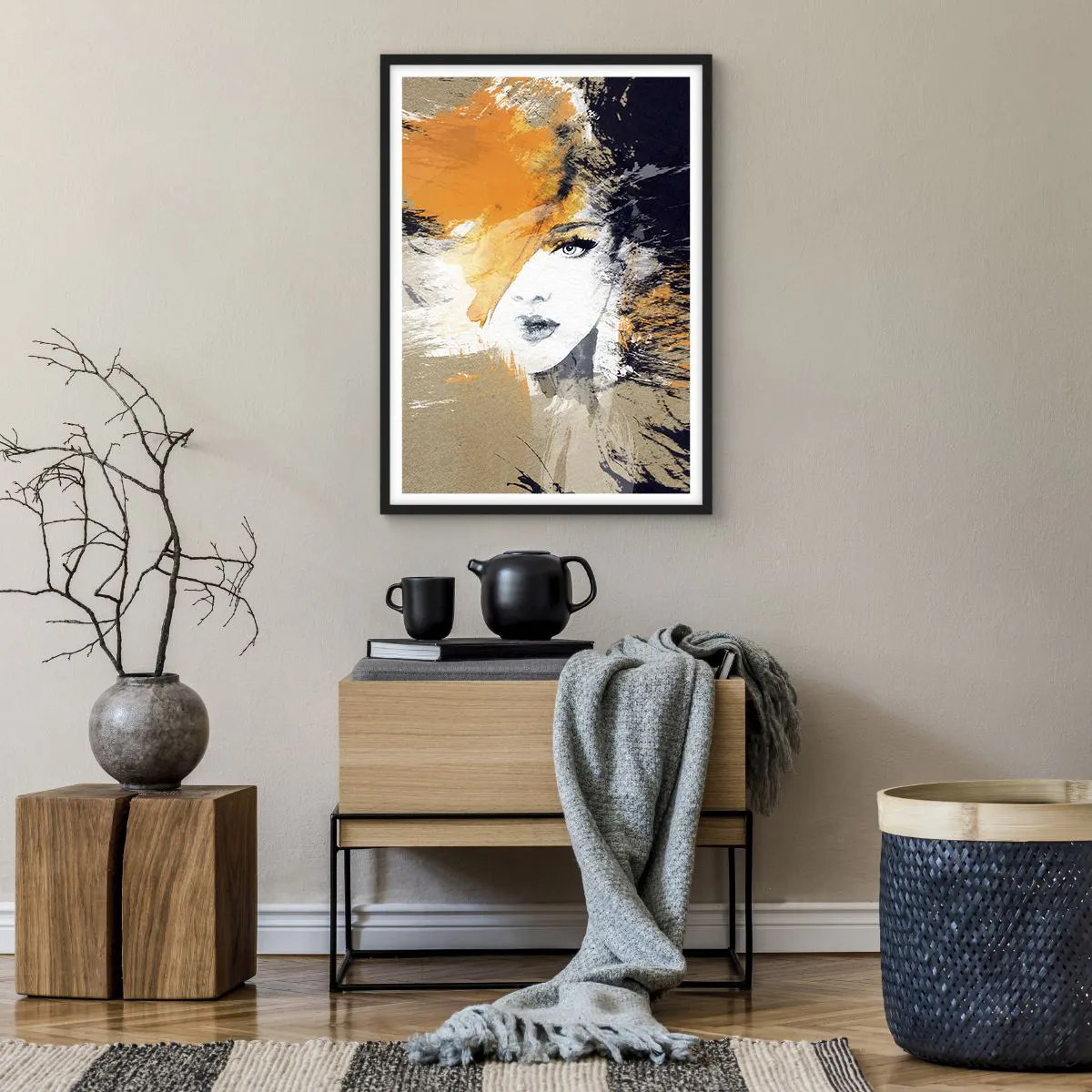 Plakat i sort ramme - Portræt af en kvinde i kunstnerisk stil med orange accenter - 50x70cm - Og det bliver let - Moderne vægdekoration til stue og soveværelse ARTTOR