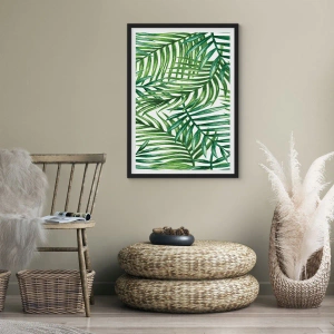 Palmebladene er afbildet i livlige grønne nuancer, der opliver rummet og skaber en atmosfære af afslapning. Subtile detaljer understreger naturens skønhed, og bladenes minimalistiske arrangement gør, at plakaten passer perfekt til en moderne dekorativ stil.