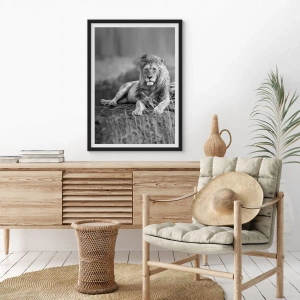 Plakat i sort ramme - Sort-hvidt portræt af en majestætisk løve mod savannens baggrund - 50x70cm - Kongelig siesta - Moderne vægdekoration til stue og soveværelse ARTTOR