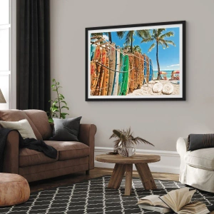 - Denne plakat forestiller surfbrætter på en tropisk strand med palmer og en blå himmel. Den er perfekt til sommer- og ferieinspirerede interiører og leveres med en elegant sort ramme.