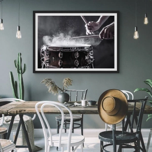Plakat i sort ramme - Trommer slået med pinde med en krudtsprøjteeffekt - 50x70cm - Musikkens puls - Moderne vægdekoration til stue og soveværelse ARTTOR