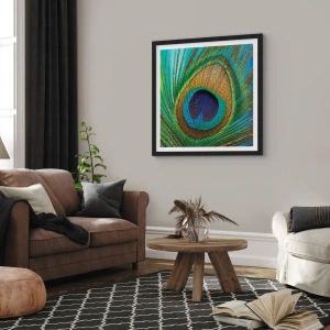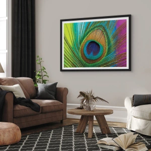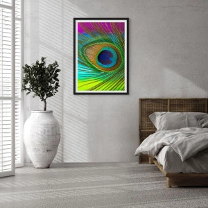 Plakat i sort ramme - Detalje af en påfuglefjer i intense farver - 50x70cm - Øje mod øje - Moderne vægdekoration til stue og soveværelse ARTTOR