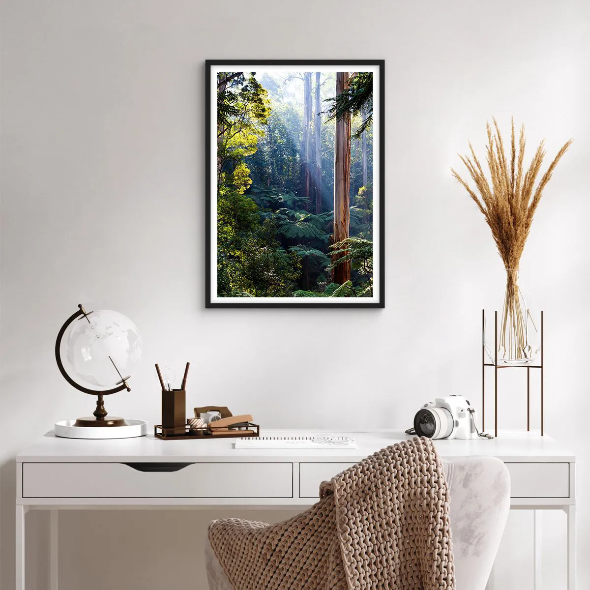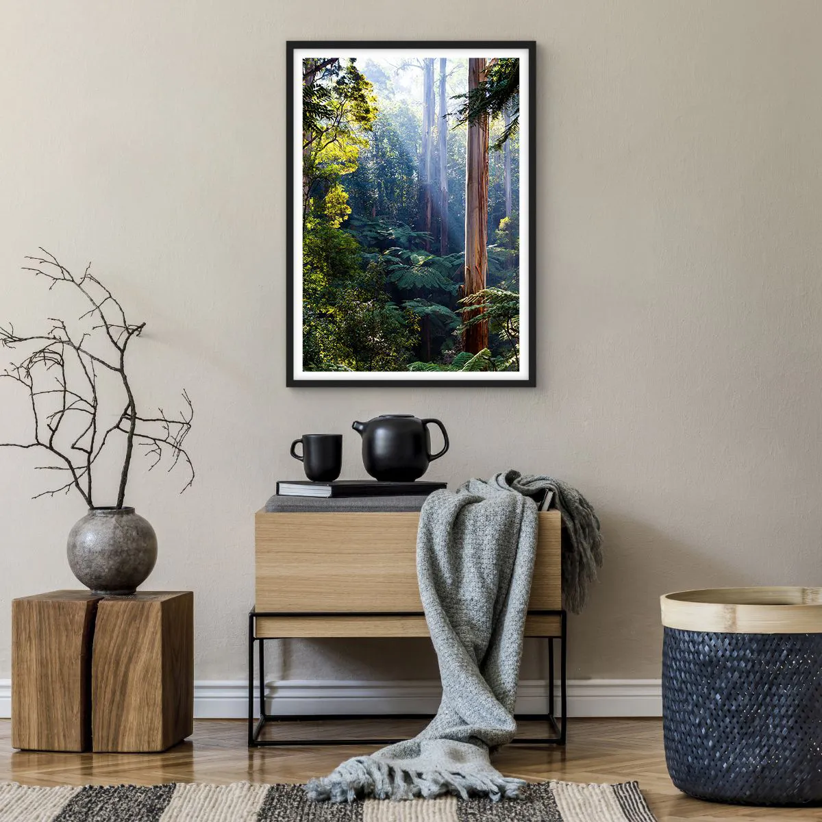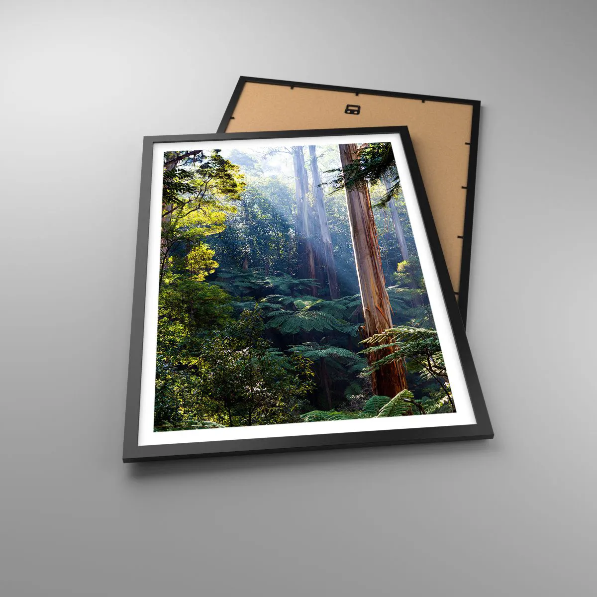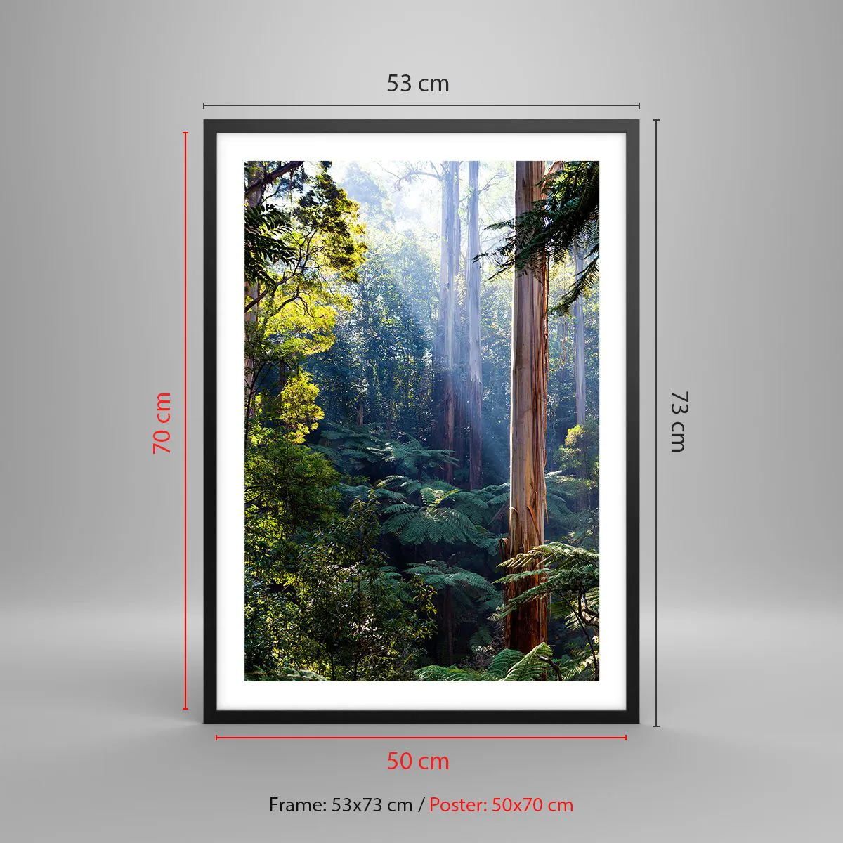 Plakat i sort ramme - Tropisk regnskov oplyst af sollys - 50x70cm - En fortælling om skoven - Moderne vægdekoration til stue og soveværelse ARTTOR