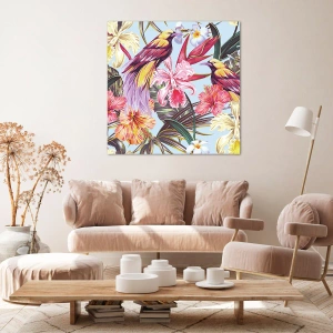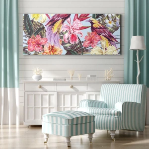 - Dette maleri forestiller eksotiske fugle omgivet af farverige tropiske blomster. Perfekt til tropiske interiører eller dem, der værdsætter en eksotisk æstetik.