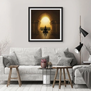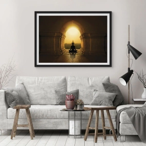 - Plakaten forestiller en figur, der mediterer i en tempelbue mod den opgående sols baggrund. Kompositionen formidler harmoni og spiritualitet og passer perfekt til minimalistiske og afslappende rum.