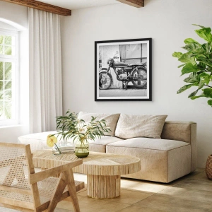- Plakaten "Retro Motorcycle" forestiller en klassisk vintage motorcykel placeret op ad en trævæg. Det monokromatiske farveskema fremhæver dens rå og nostalgiske karakter. Den leveres komplet med en sort ramme.