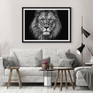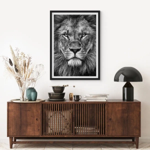 Plakat i sort ramme - Sort-hvidt portræt af en majestætisk løve - 50x70cm - I kroningsklædning - Moderne vægdekoration til stue og soveværelse ARTTOR