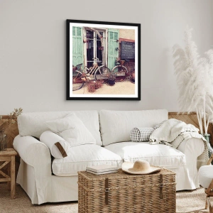 Plakat i sort ramme - En gammel cykel foran grønne træskodder - 50x70cm - Længe leve provinsen - Moderne vægdekoration til stue og soveværelse ARTTOR