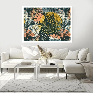 • Grafik, Tropisk blomst, Blad, Botanik, Til kontoret, Til studiet, Til spisestuen, Til hallen, Til stuen, Til soveværelset, Hvid, sort, orange, grå, gul, Kvadratisk