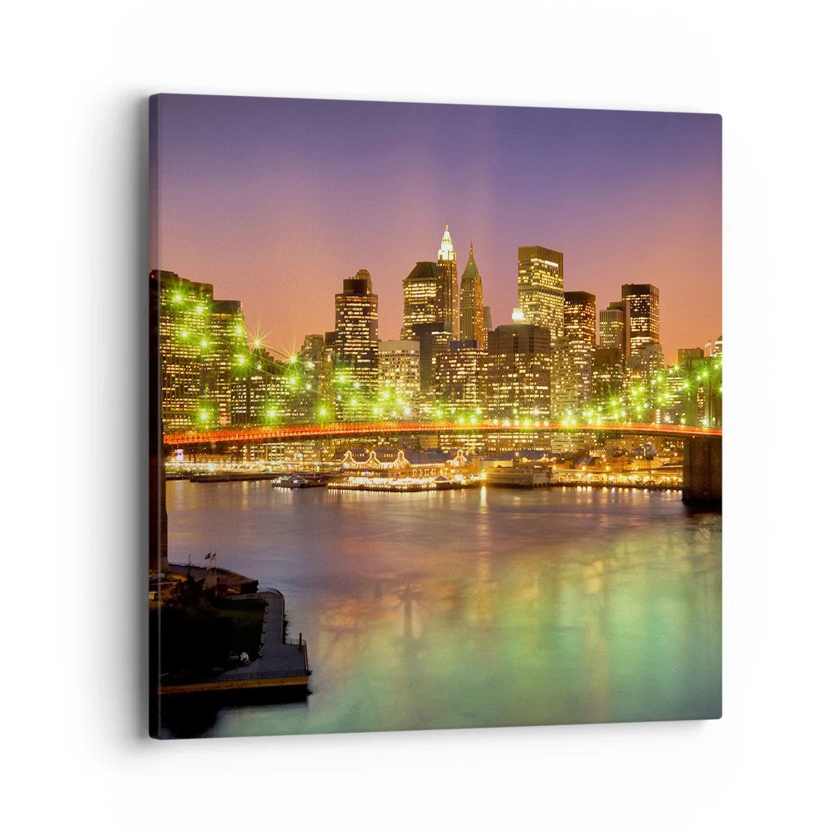 Lærredet er spændt op over rammen. Siderne og kanterne trykkes for at danne en fortsættelse af billedet. Maleriet er klar til at blive hængt op på væggen. Hvert produkt har en bøjle, der er fastgjort til rammen, og et samlesæt (skrue + dyvel).