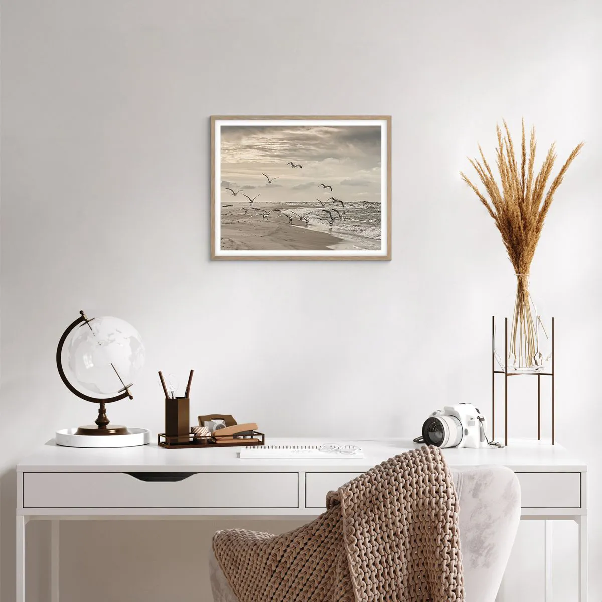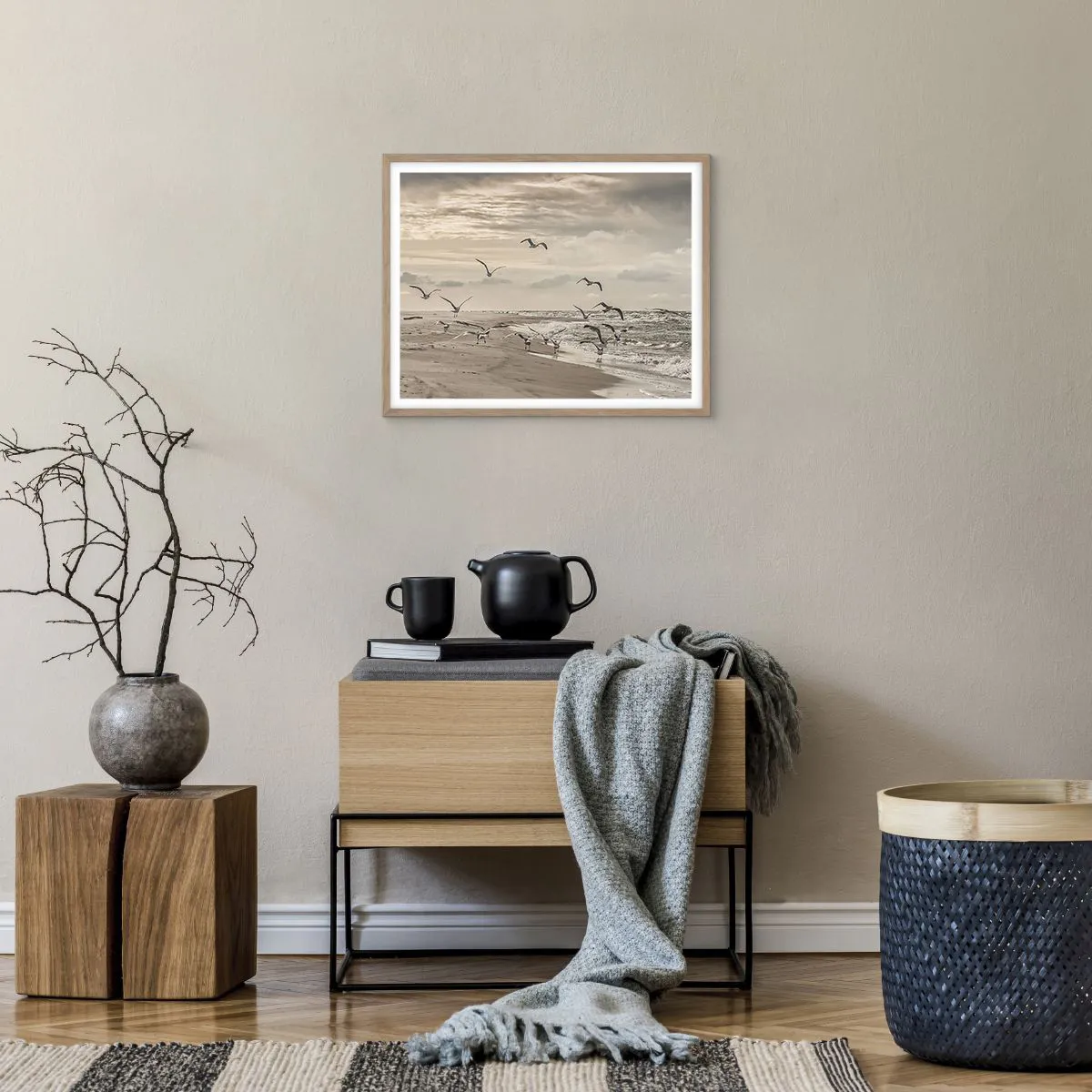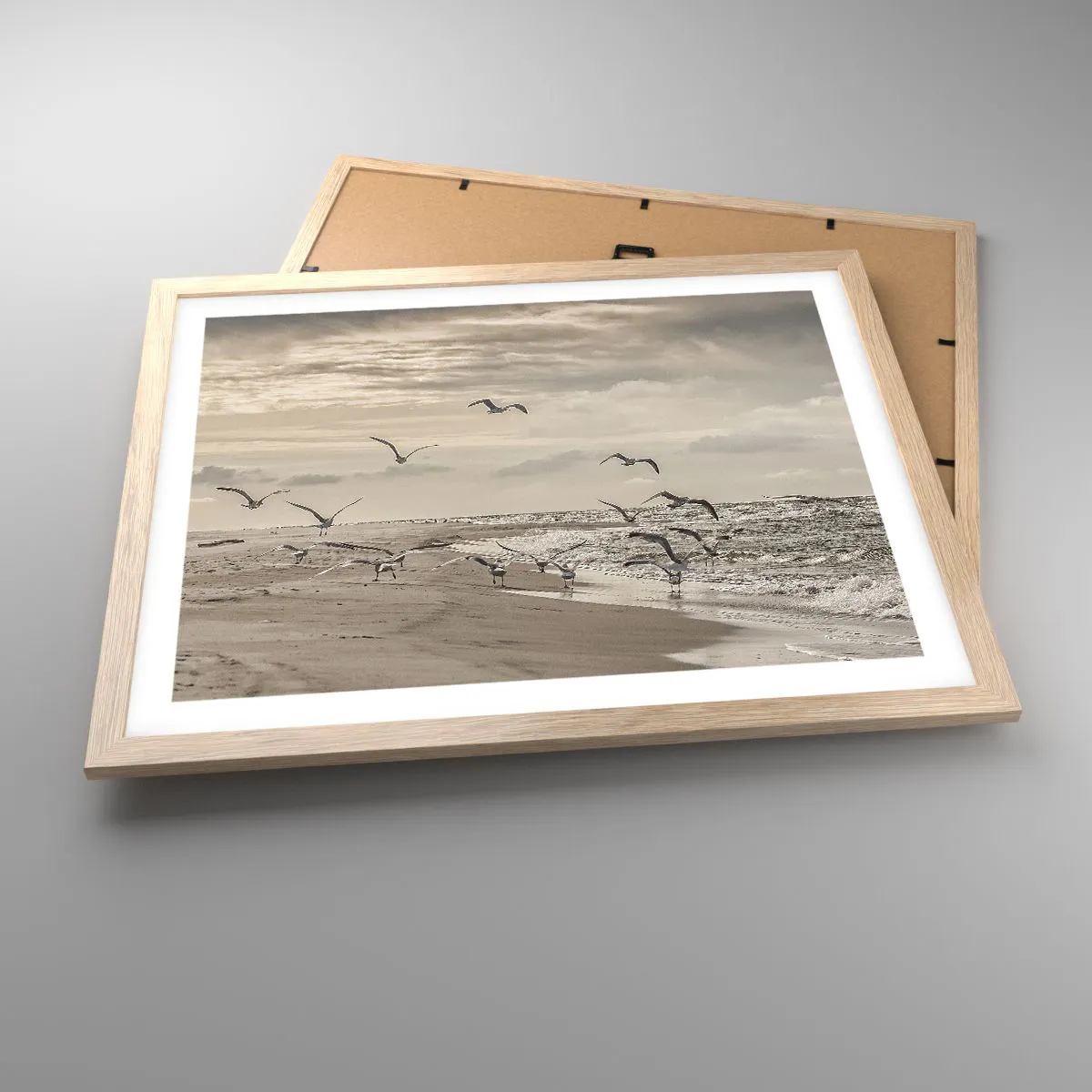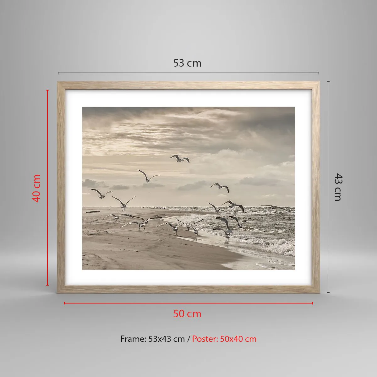Plakat i ramme af lyst egetræ - Havet brummer, fuglene synger - 50x40 cm