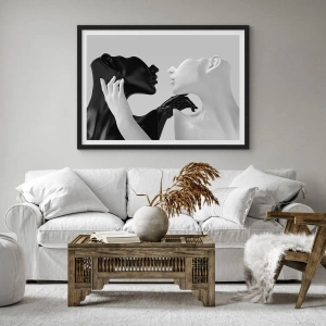 Plakat i sort ramme - En sort-hvid komposition af to ansigter i tæt kontakt. - 50x70cm - Tiltrækning - begær - Moderne vægdekoration til stue og soveværelse ARTTOR