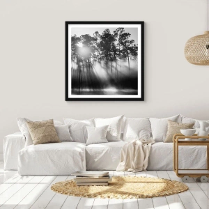Plakaten "Ustoppelig sol" er et smukt kunstnerisk fotografi, der skildrer en sort-hvid skovscene med subtile solstråler, der trænger gennem tågen. Denne komposition begejstrer med sin minimalistiske karakter og atmosfæriske atmosfære, der bringer harmoni og elegance til ethvert interiør.