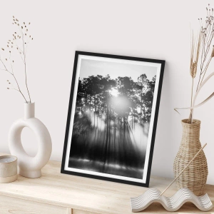 Plakat i sort ramme - Sort-hvid skovscene med solstråler i tågen - 50x70cm - Ustoppelig sol - Moderne vægdekoration til stue og soveværelse ARTTOR