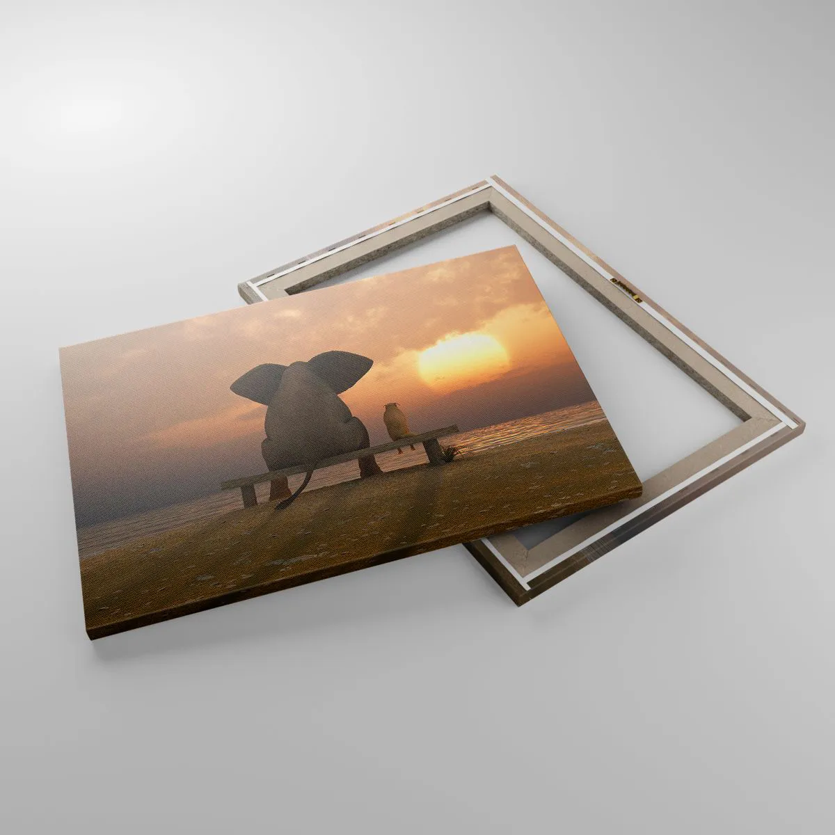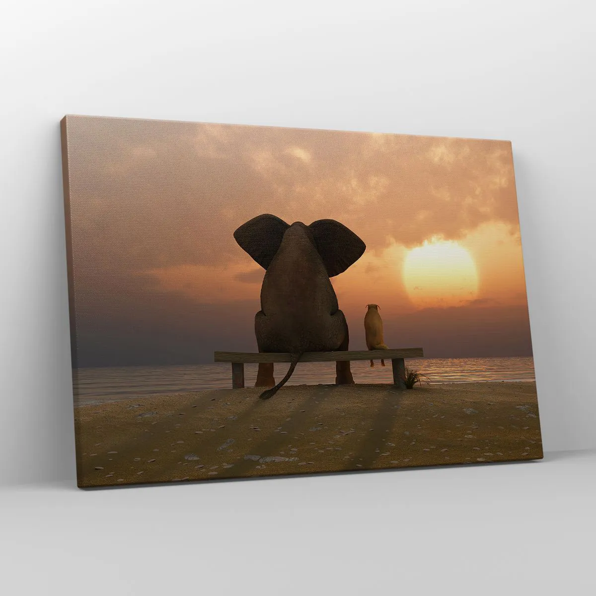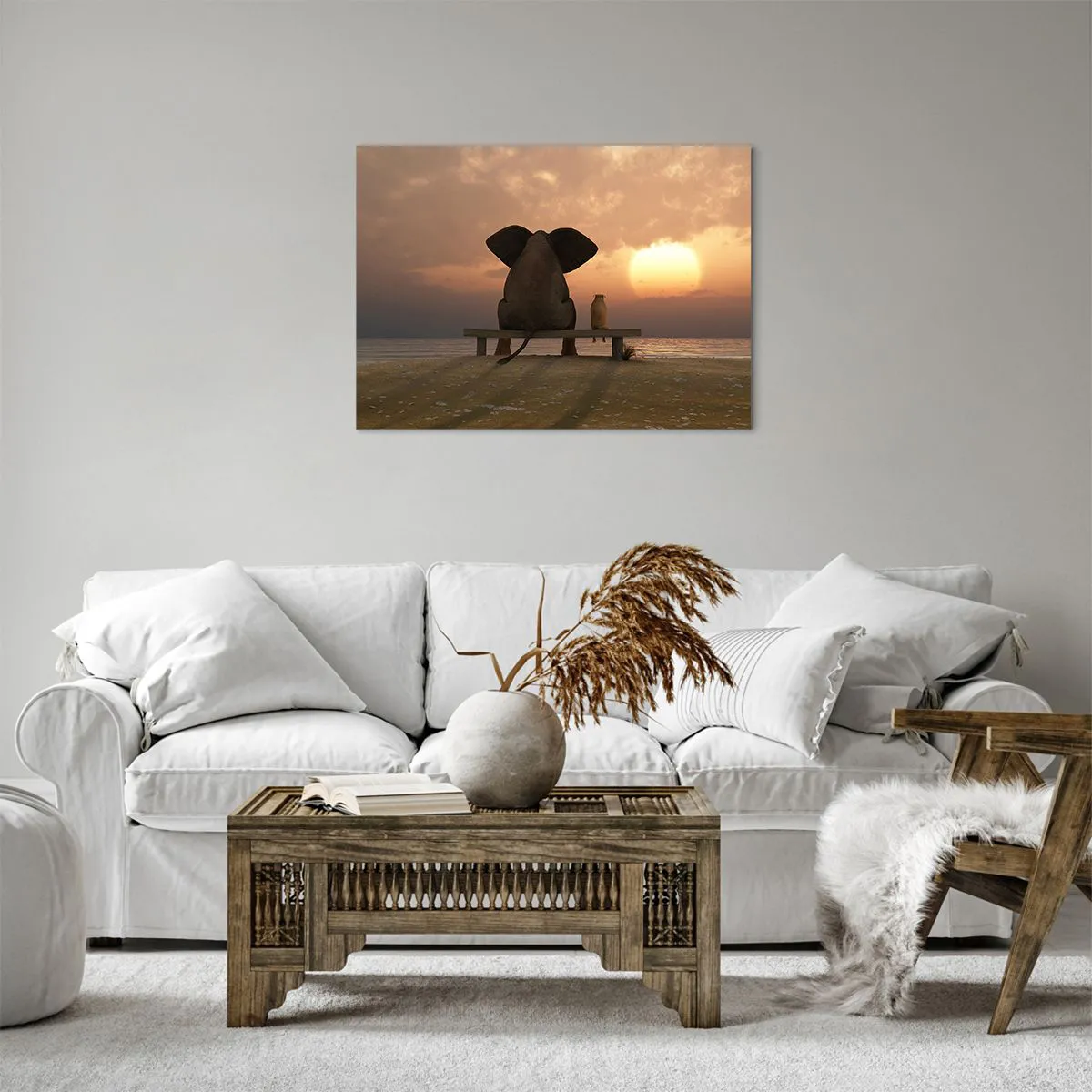 Lærredstryk - Billede på lærred - En elefant og en hund sidder på en bænk på stranden under solnedgang. - 70x50cm - Det er godt at være stille sammen - Moderne vægdekoration til stue og soveværelse ARTTOR