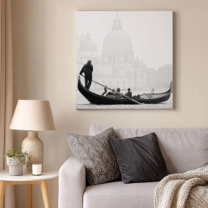 Maleriets farver er begrænset til sort og hvid, hvilket giver det en minimalistisk og tidløs stil. Kontrasten mellem den lyse baggrund og den mørke gondol skaber en karakteristisk og harmonisk komposition, der passer perfekt ind i en række forskellige indretningsdesigns, både klassiske og moderne.