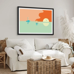 Plakat i sort ramme - En minimalistisk solnedgang med en sejlbåd i baggrunden - 50x70cm - Det perfekte havlandskab - Moderne vægdekoration til stue og soveværelse ARTTOR