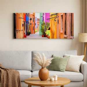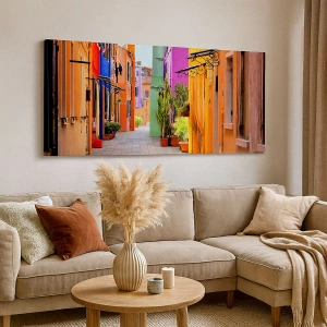 Lærredstrykket "Farverig gade i middelhavsstil" er en kombination af kunst og kvalitet. Det er en dekoration, der beriger ethvert interiør og tilføjer varme, harmoni og et strejf af romantik.