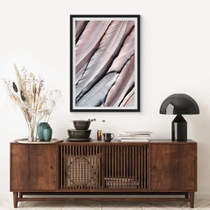 Plakat i sort ramme - Nærbillede af sarte, pastelfarvede fjer - 50x70cm - I lyserødt sølv - Moderne vægdekoration til stue og soveværelse ARTTOR