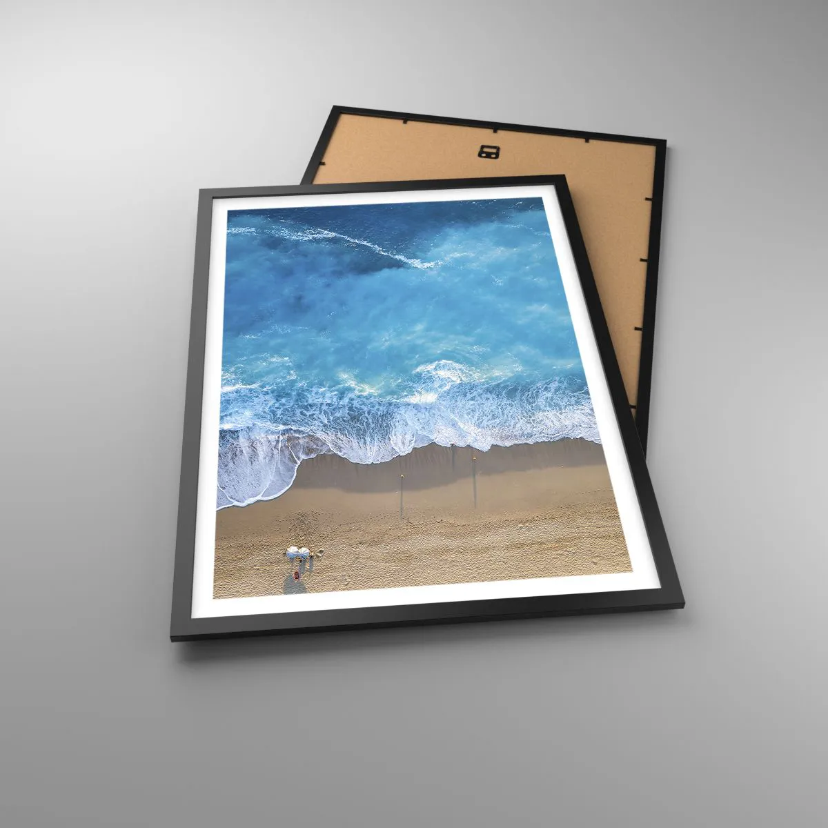 - Plakaten forestiller et luftfoto af havbølger, der slår ind mod en sandstrand. Vandets intense blå farve står i kontrast til sandets varme nuance og skaber en harmonisk og rolig komposition.