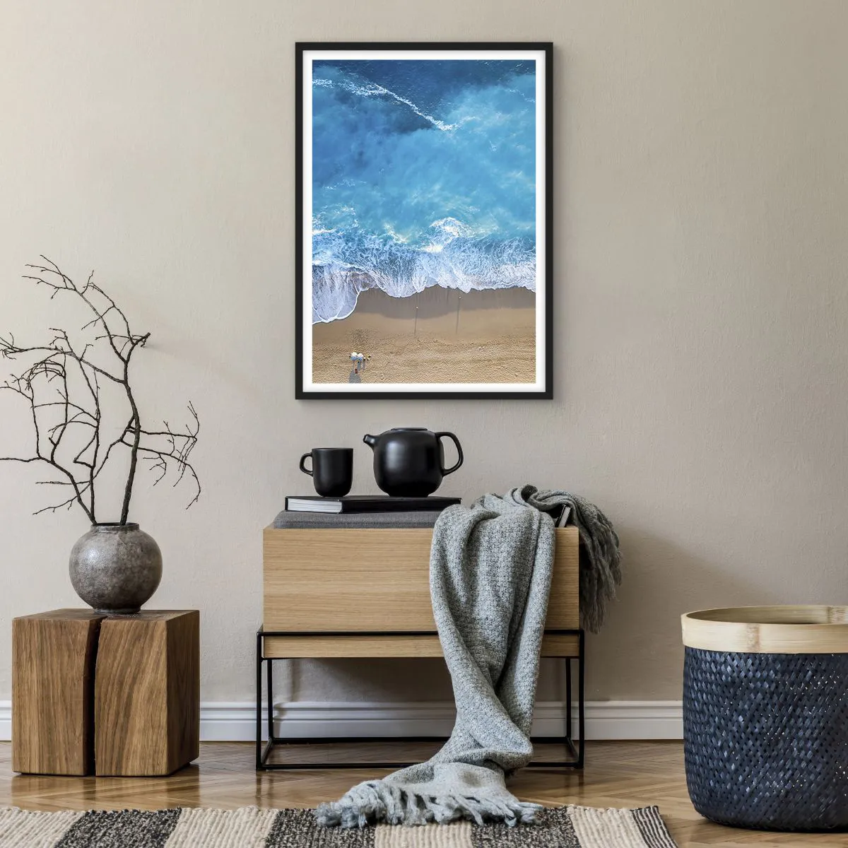 "Den Blå Kraft" er en ekstraordinær plakat, der viser et fugleperspektiv af havbølger, der slår mod en sandstrand. Vandets intense blå farve og de subtile nuancer af sand skaber en komposition, der tiltrækker opmærksomhed og introducerer en atmosfære af afslapning og harmoni i interiøret. Hver detalje i dette billede indfanger naturens kraft og skønhed.