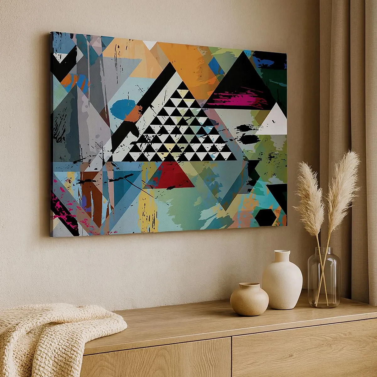 - Et moderne maleri på lærred, der forestiller en abstrakt komposition af geometriske former i levende farver, perfekt egnet til moderne interiører.