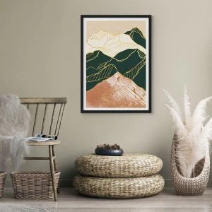 "Golden Peaks" er en elegant plakat, der kombinerer elementer af abstraktion og et naturligt landskab. Den forestiller stiliserede bjerge tegnet med gyldne linjer, som giver kompositionen en unik elegance og harmoni. Farverne dybgrøn, varm brun og delikat beige skaber en sammenhængende og fredelig helhed.