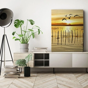 Lærredstryk - Billede på lærred - Solnedgang over vandet med fugle i flugt - 70x50cm - I fiskeriet - Moderne vægdekoration til stue og soveværelse ARTTOR