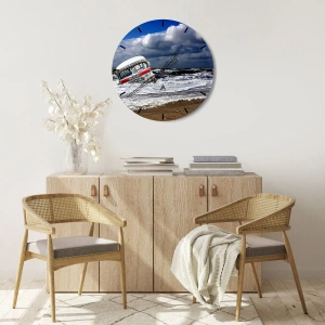 - Dette runde vægur har en retrobus mod en baggrund af stormfuldt hav og dramatiske skyer. Perfekt til nostalgikere og unikke indretningsmuligheder. Formatet på 30x30 cm er fremstillet af glas.
