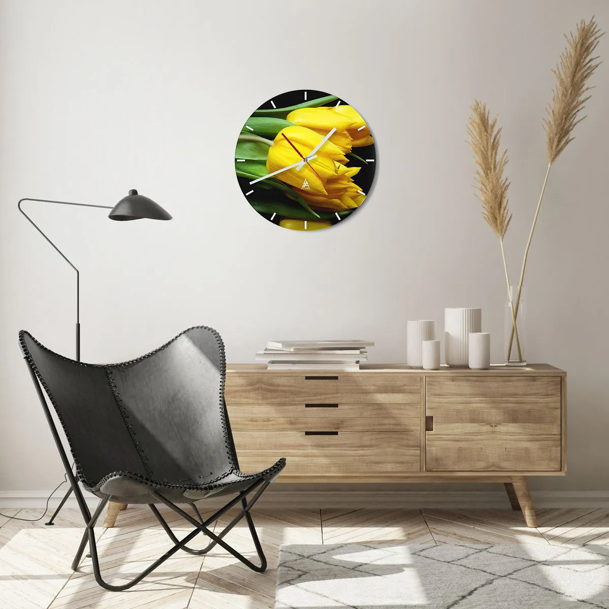Uret på glas er klar til at hænge på væggen, det er udstyret med en monteret metalophæng for nem montering