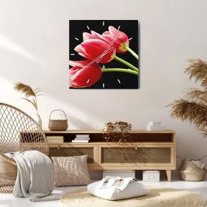 Vægur, Uret - Røde tulipaner med vanddråber på sort baggrund - 30x30cm - Løftet om ren kærlighed - Moderne vægdekoration til stue, køkken og soveværelse ARTTOR