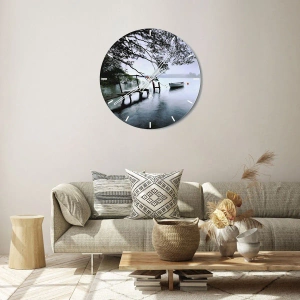 Du hviler allerede er et elegant vægur, der bringer freden og harmonien fra et naturlandskab ind i dit interiør. Motivet af en båd fortøjet ved en mole omgivet af træer ved en rolig sø introducerer en atmosfære af afslapning og ro i rummet. Det er det perfekte valg for dem, der ønsker at bringe lidt natur og trøst ind i deres hjem.