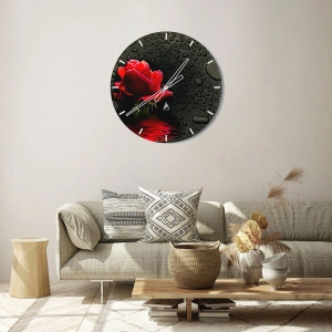 Vægur, Uret - Rød rose med vanddråber på en sort baggrund - 30x30cm - Rød og sort - Moderne vægdekoration til stue, køkken og soveværelse ARTTOR