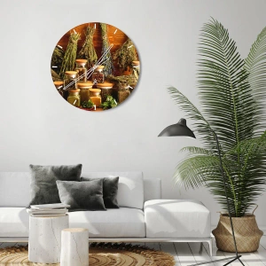 Væguret "Kitchen Magic" er et perfekt valg for elskere af naturlige ingredienser og en varm, rustik stil. Dets unikke motiv har omhyggeligt arrangerede tørrede krydderurter, såsom lavendel og timian, og aromatiske krydderier i trækrukker. Det hele suppleres af en hyggelig baggrund af naturligt træ, der tilføjer karakter og harmoni til interiøret.