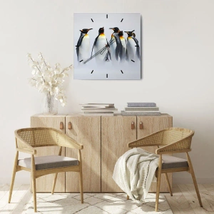 Vægur, Uret - En gruppe pingviner mod tågen - 30x30cm - Møde i aftenkjole - Moderne vægdekoration til stue, køkken og soveværelse ARTTOR