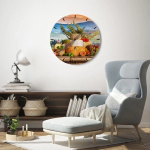 Væguret "Italiensk livsglæde" er en unik dekoration, der kombinerer motivet fra et ostebræt og tilbehør med charmen fra et malerisk landskab. Sammensætningen af rige farver, såsom orange, grøn og nuancer af naturligt træ, giver interiøret varme og en unik karakter.