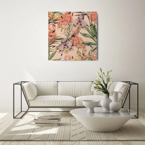 Delikate nuancer af lyserød og grøn harmonerer perfekt med den beige baggrund og skaber en varm og venlig atmosfære. Det tropiske motiv gør uret til en unik dekoration, der bringer et strejf af natur og eksotisme til interiøret.