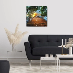 Vægur, Uret - En træbro, der fører til søen ved solnedgang - 30x30cm - Tag dig god tid, sæt dig ned - Moderne vægdekoration til stue, køkken og soveværelse ARTTOR