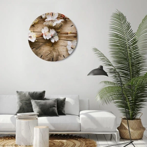 - Et vægur med blomstrende kirsebærblomster mod en træpladebaggrund. Perfekt til naturelskere og afdæmpet indretning.