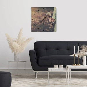 Vægur, Uret - En hånd, der holder en flok mælkebøtter mod en sløret mark - 30x30cm - Behold dem, venligst - Moderne vægdekoration til stue, køkken og soveværelse ARTTOR