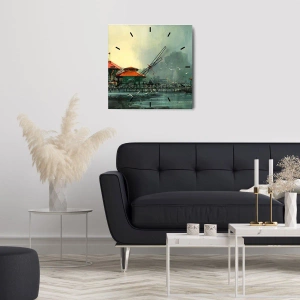 Vægur, Uret - En havnescene med en mole og bygninger mod en overskyet himmel - 30x30cm - En regnvejrsdag på havnen - Moderne vægdekoration til stue, køkken og soveværelse ARTTOR