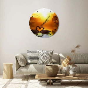 - Dette vægur har et romantisk motiv af to sorte svaner på en sø ved solnedgang. Perfekt til naturelskere og subtil indretning, det bringer fred og harmoni til ethvert interiør.