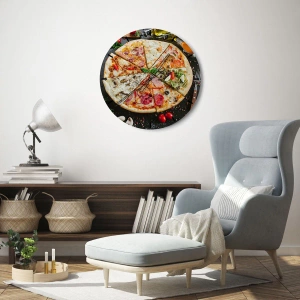 "Et udvalg af smagsvarianter" er et unikt vægur, hvis urskive viser en lækker pizza med forskellige toppings på sort baggrund. Dette motiv udstråler kulinarisk charme og tilføjer et lækkert præg til ethvert interiør.