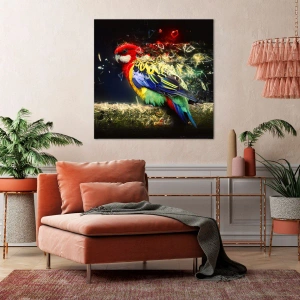 - Dette lærredstryk på 70x50 cm forestiller en papegøje i livlige farver mod en baggrund af lyseffekter. Perfekt til moderne interiører, det tilføjer et unikt præg og kunstnerisk præg til ethvert rum.