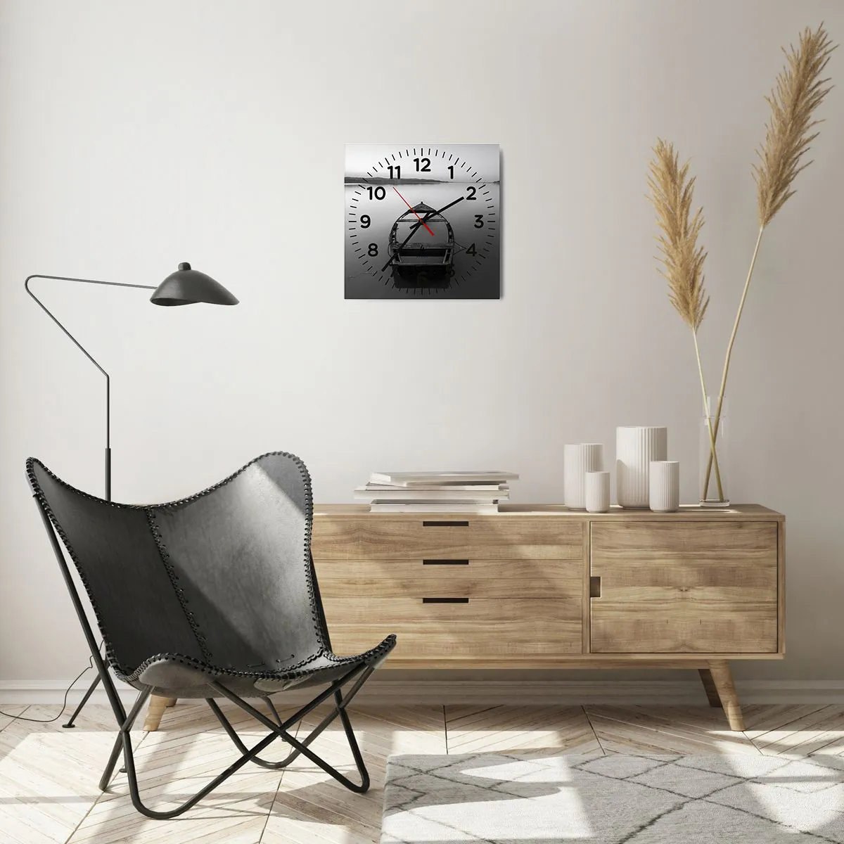 Uret på glas er klar til at hænge på væggen, det er udstyret med en monteret metalophæng for nem montering