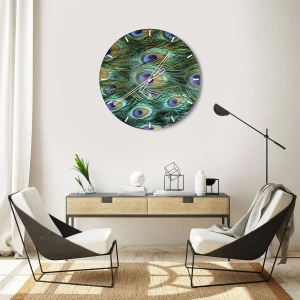 Påfuglefjer i nuancer af grøn og blå er hovedmotivet på dette unikke vægur. Uret er lavet på 30x30 cm glas og kombinerer elegance og natur og bliver en dekoration til ethvert interiør.