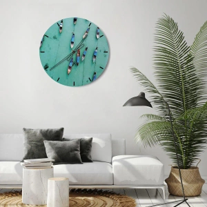 "Både på turkis vand" er et originalt vægur, der forestiller et fugleperspektiv af både, der flyder på roligt, turkis vand. Billedet formidler en følelse af lethed og harmoni og introducerer et naturinspireret motiv i interiøret.