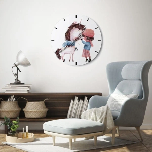 Vægur - Winter Tale - Pige i vintertøj kysser en enhjørning på en hvid baggrund